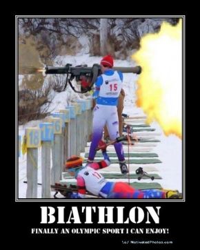 Biathlon: People try to slide horizontally on two planks as fast as they can while shooting guns at targets. How team USA loses at this event ever is probably because they aren’t using an automatic rifle with a bump stock at an elementary school.